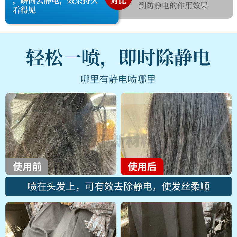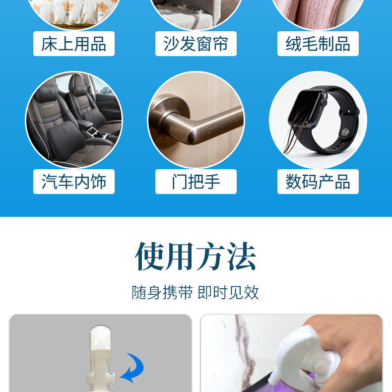 适用于头发、衣物、丝袜、围巾、西装、外套、羽绒服、针织帽子、玩具、地毯、沙发、窗帘、纯棉衣料、聚酯衣料、各类人造纤维衣料、家用衣料、羊毛衣料、冷水洗涤衣料、门把手等各类物品表面。