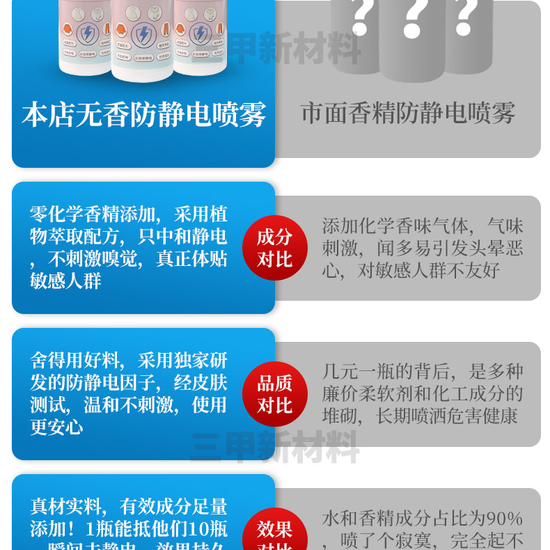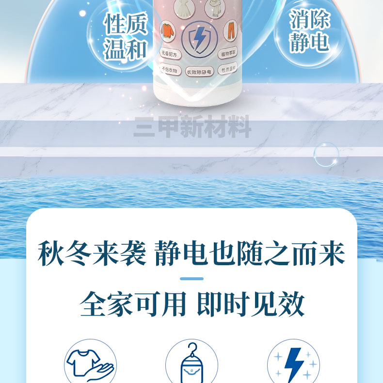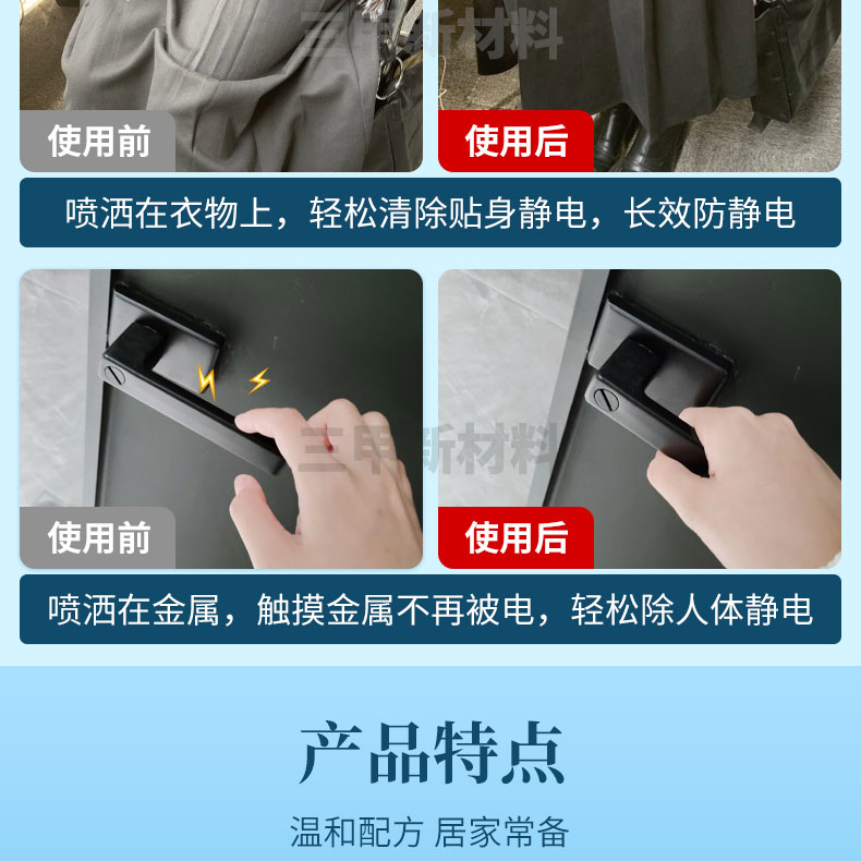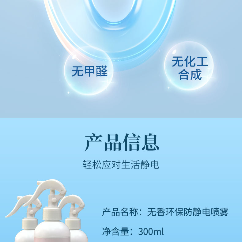 本品采用无香配方,性质温和,能瞬间去除静电且长效防静电。适用方法简单,按压打开喷头开关后,距离目标15cm处均匀喷洒,大件或者厚实衣物需内外喷洒。